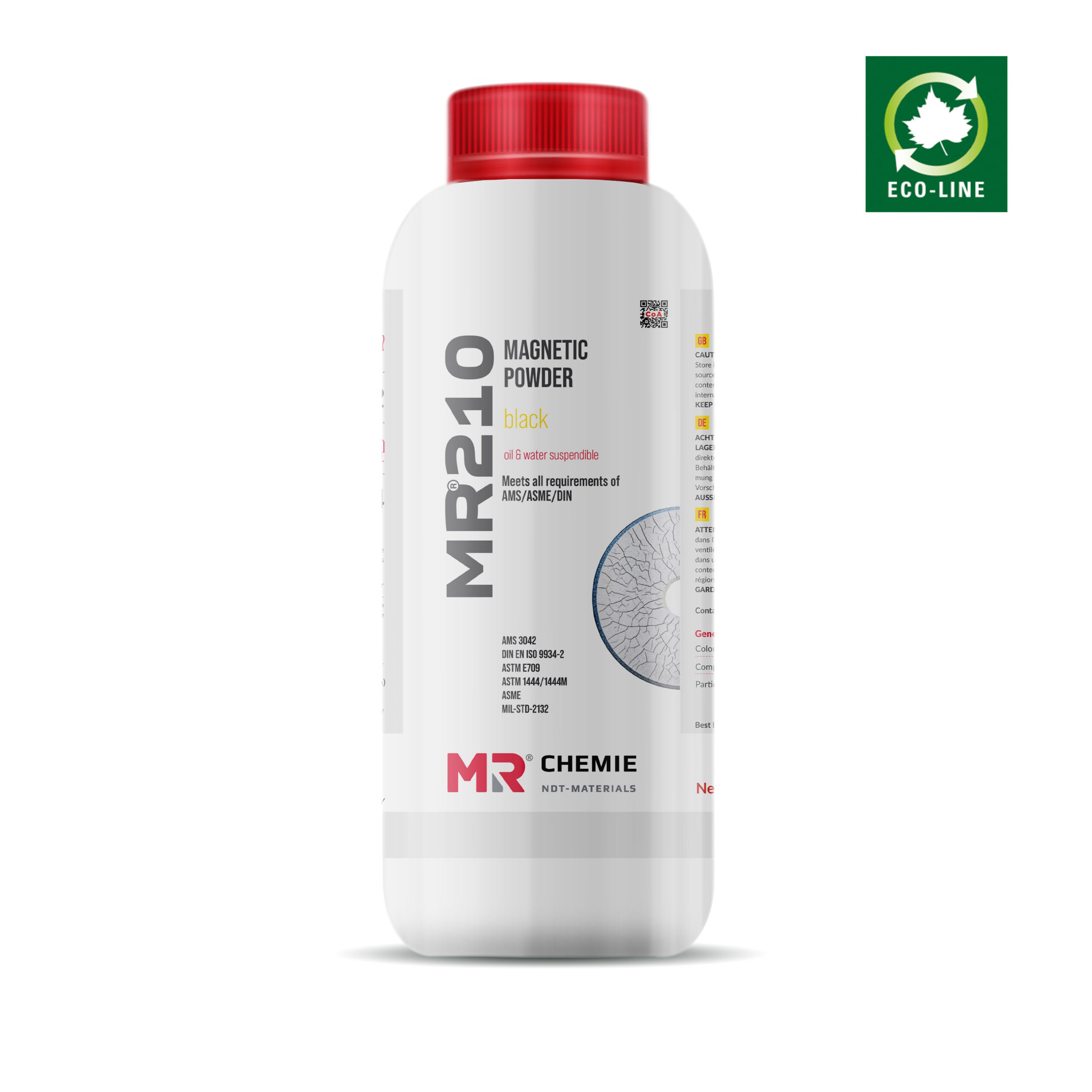 MR®210 is an ECOLINE, dry black ferromagnetic powder designed to be used with oil or water (along with conditioner) which is used for Magnetic Particle Testing (MPT). MR210 particles are manufactured for an optimum sensitivity, excellent discontinuity definition, colour with minimal to nil background and magnetic characteristics for wet method visible MPT. It detects surface and slightly sub surface discontinuities such as cracks, inclusions, seams, tears, laps, flakes and other welding defects.
