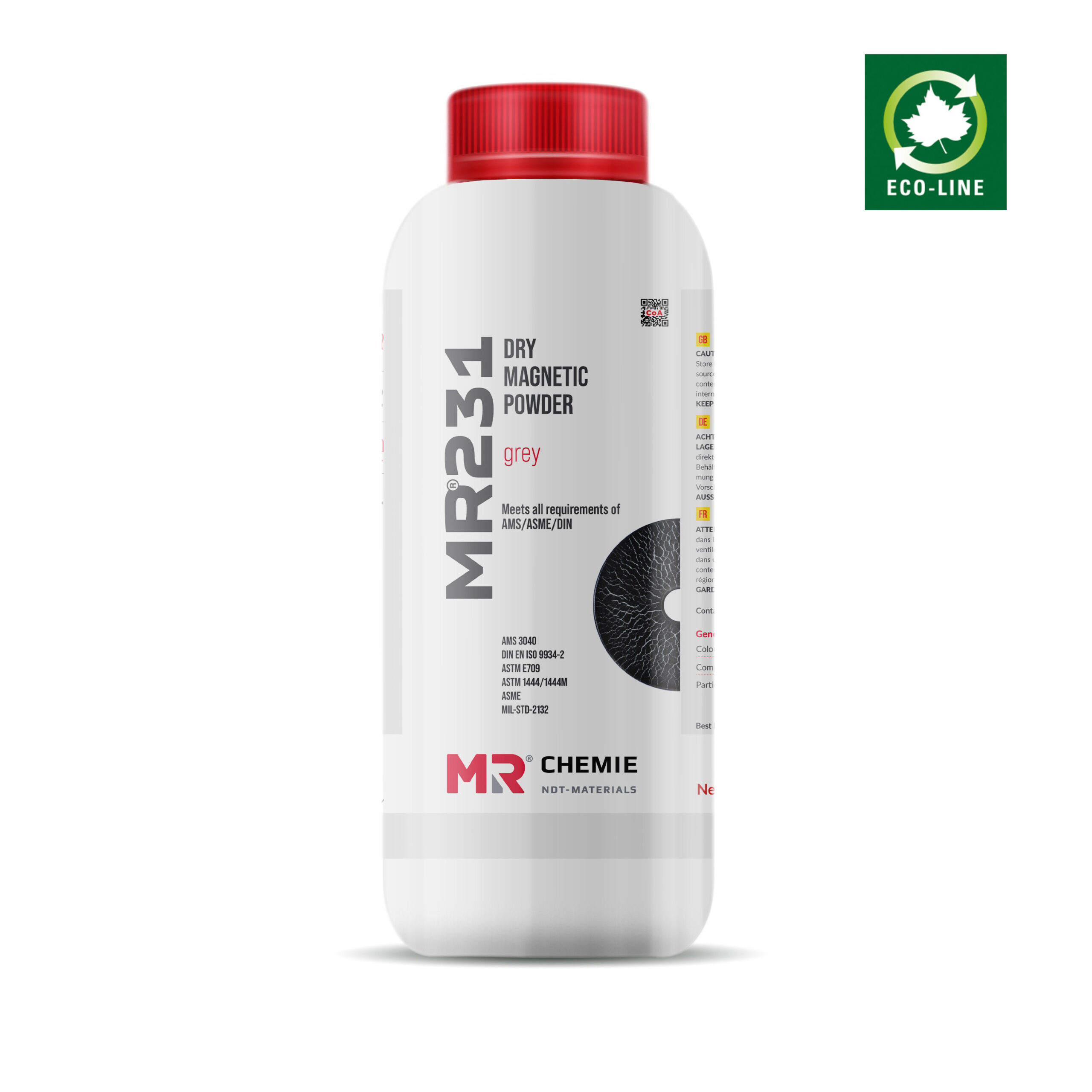 MR®231 is a highly refined grey ferromagnetic powder that provides strong contrast on most metal surfaces during dry method magnetic particle testing in visible light. It is ready-to-use for visible light flaw detection of surface and slightly subsurface discontinuities in ferrous metals. It can be used in a powder blower or shaken from a bottle during magnetization, and blown off while current is still being applied. It can be used on weldments such as bridges, pipes, large tanks, machineries and equipment. It meets or exceeds all applicable industry specifications.