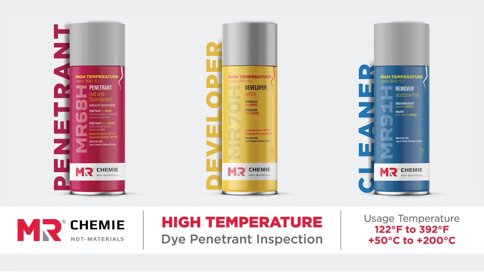 MR's High Temp DP products are specifically formulated for non-destructive testing (NDT) applications requiring inspection at elevated temperatures up to 200°C. These products are specifically engineered to withstand high temperatures while maintaining their effectiveness, making them ideal for industries such as Aerospace, Automotive, and Manufacturing where inspections at elevated temperatures are common.