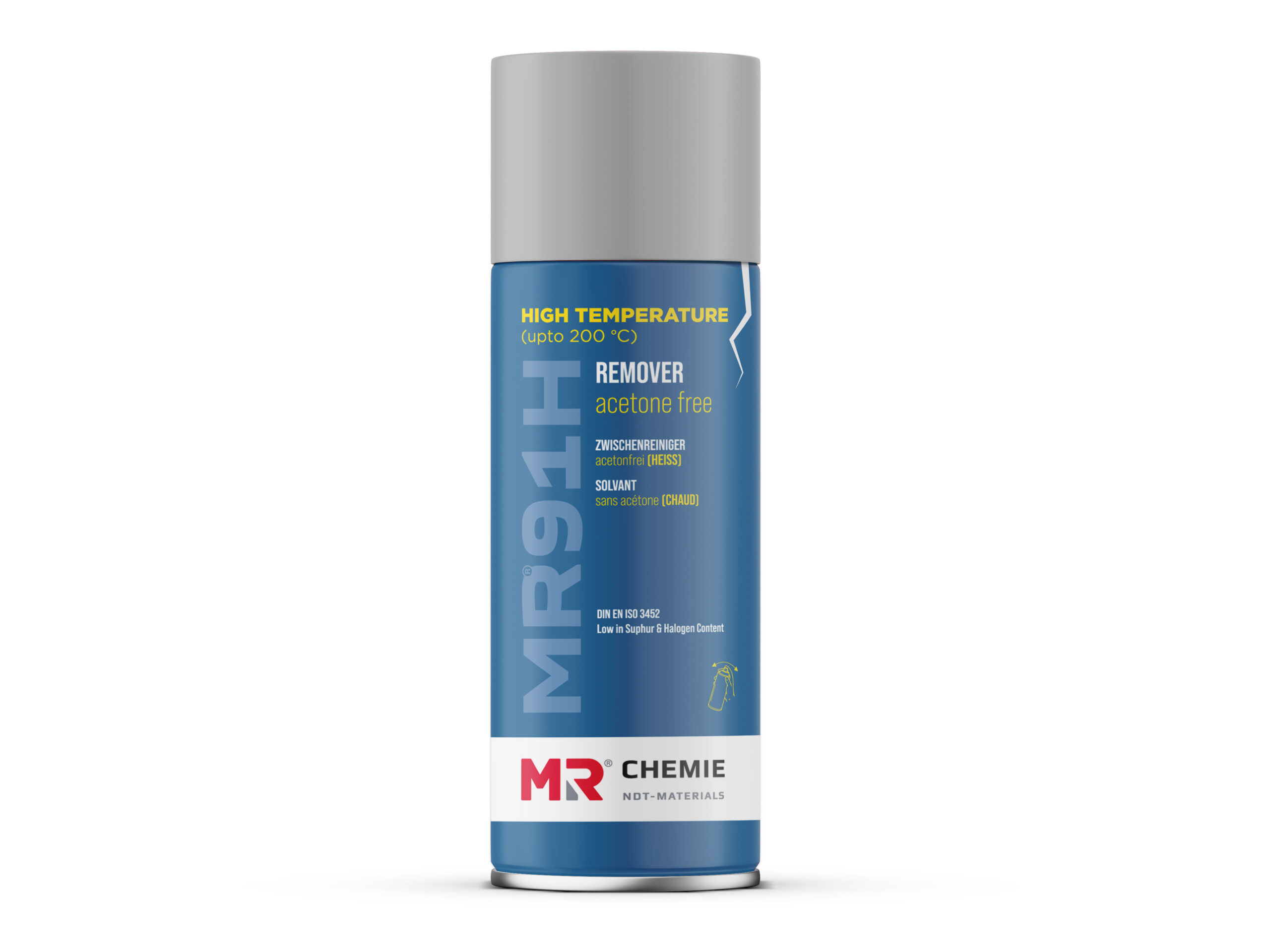 MR®91H is a NDT-approved non-halogenated hydrocarbon-based cleaner/remover for pre-cleaning (removes oils, greases and other contaminants) and removing excess surface penetrant from an inspection area before applying developer during during dye-penetrant inspection for high temperature applications upto 200°C. It dries quickly without leaving any residue on the surface.